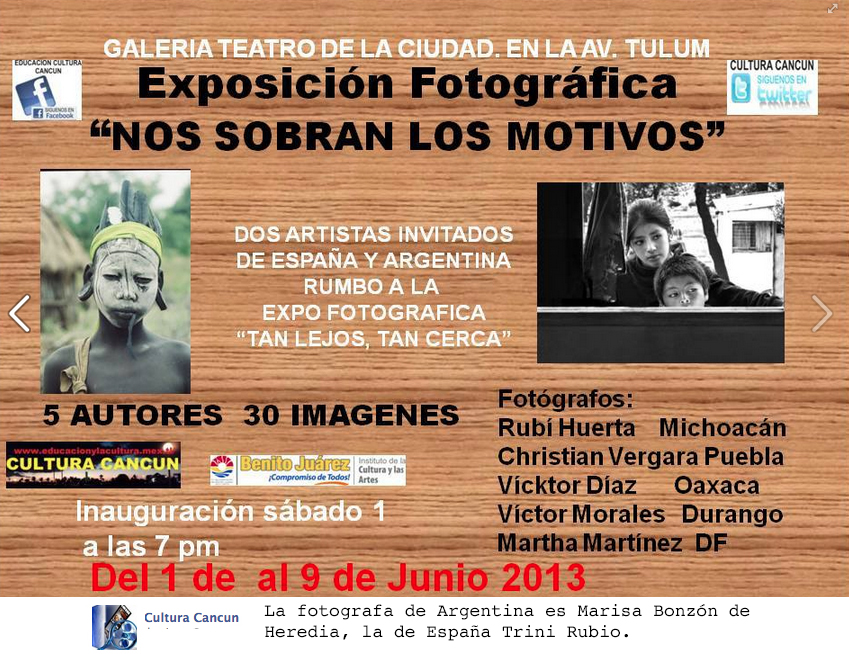 En el marco del intercambio cultural México, España y Argentina, en la Exposición Fotográfica » Nos sobran los motivos» en la ciudad de Cancún, México, se expuso una foto mía en representación del grupo expositor de «Tan lejos, tan cerca» de la ciudad de Pilar, Argentina, y otra de Trini Rubio en representación del grupo de Badía del Vallés, Barcelona; anticipando la futura exposición conjunta en Casa de Cultura Pilar en noviembre de 2013.
